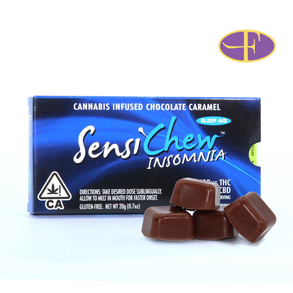 Sensi Chew Insomnia is 100mg THC chocolate caramel edible for sleep. It is infused with Cannabis and Melatonin to help fight insomnia and sleep issues. These small but mighty chews are travel friendly edibles and do not melt. Sensi Chews are fast acting THC edibles.